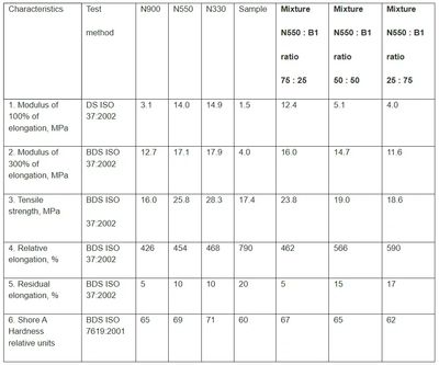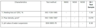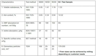 Physico-mechanical characteristics of SBR based vulcanizates, containing different types of carbon black including virgin N330, N550, N900 and our B-1 product sample.